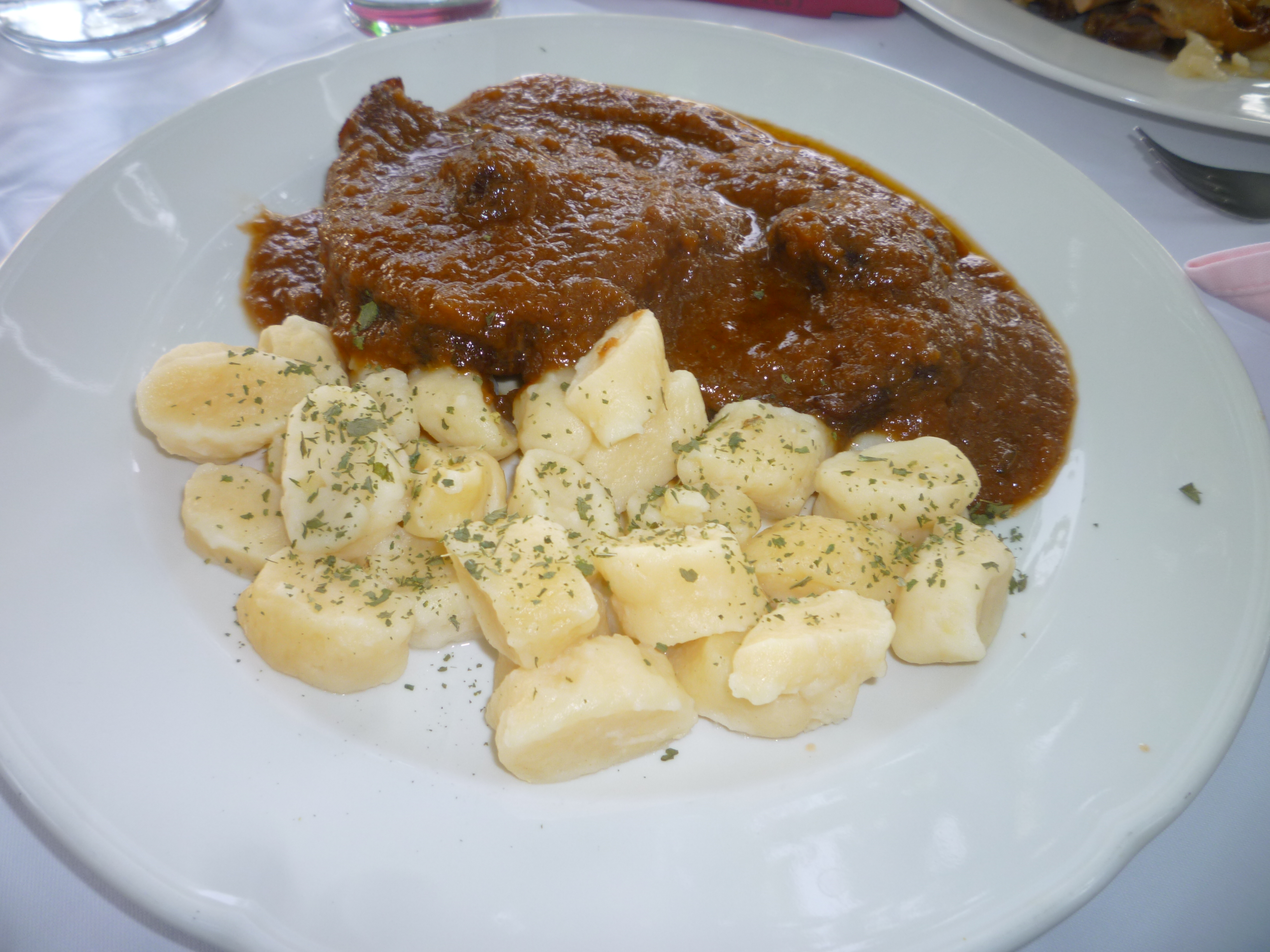 The outside terrace overlooked the city (give or take a lot of vineyard), and as we sat down a rounded, friendly-looking man with a nice beard walked over and read us the list of daily specials (in English!). Everything sounded great, and for a moment we panicked – this must be an expensive place, after all. Tentatively, I asked how much the “beef in red wine sauce with gnocchi” would cost, and was told 80 kuna (8 euros)… not bad at all, I supposed, so I ordered it while Jeff ordered duck with “mlinci” (I think), which is a lovely type of pasta. It was great, and the waiter regaled us with stories of Croatian history, before offering us free coffee.