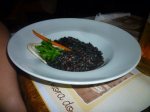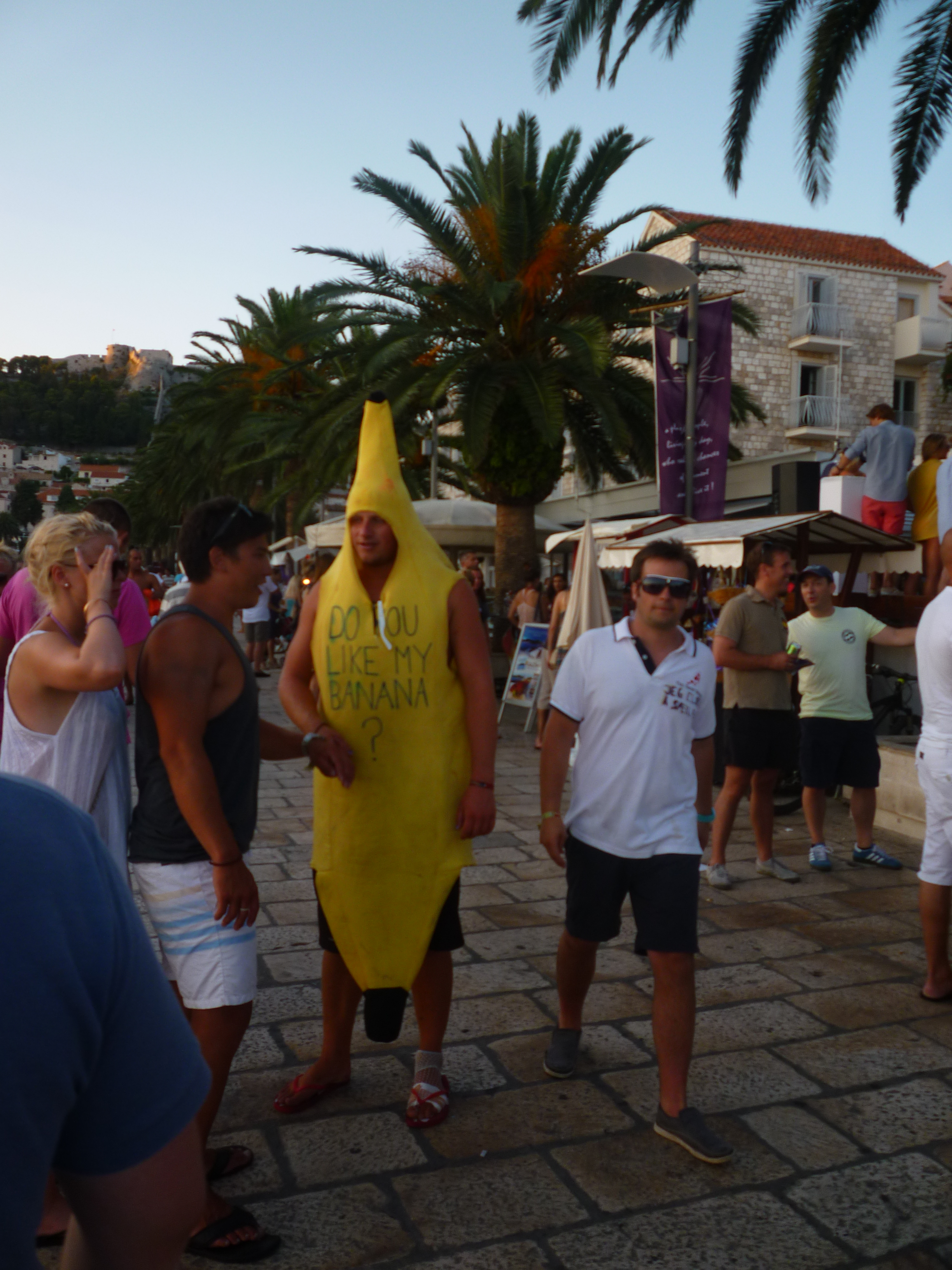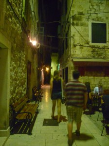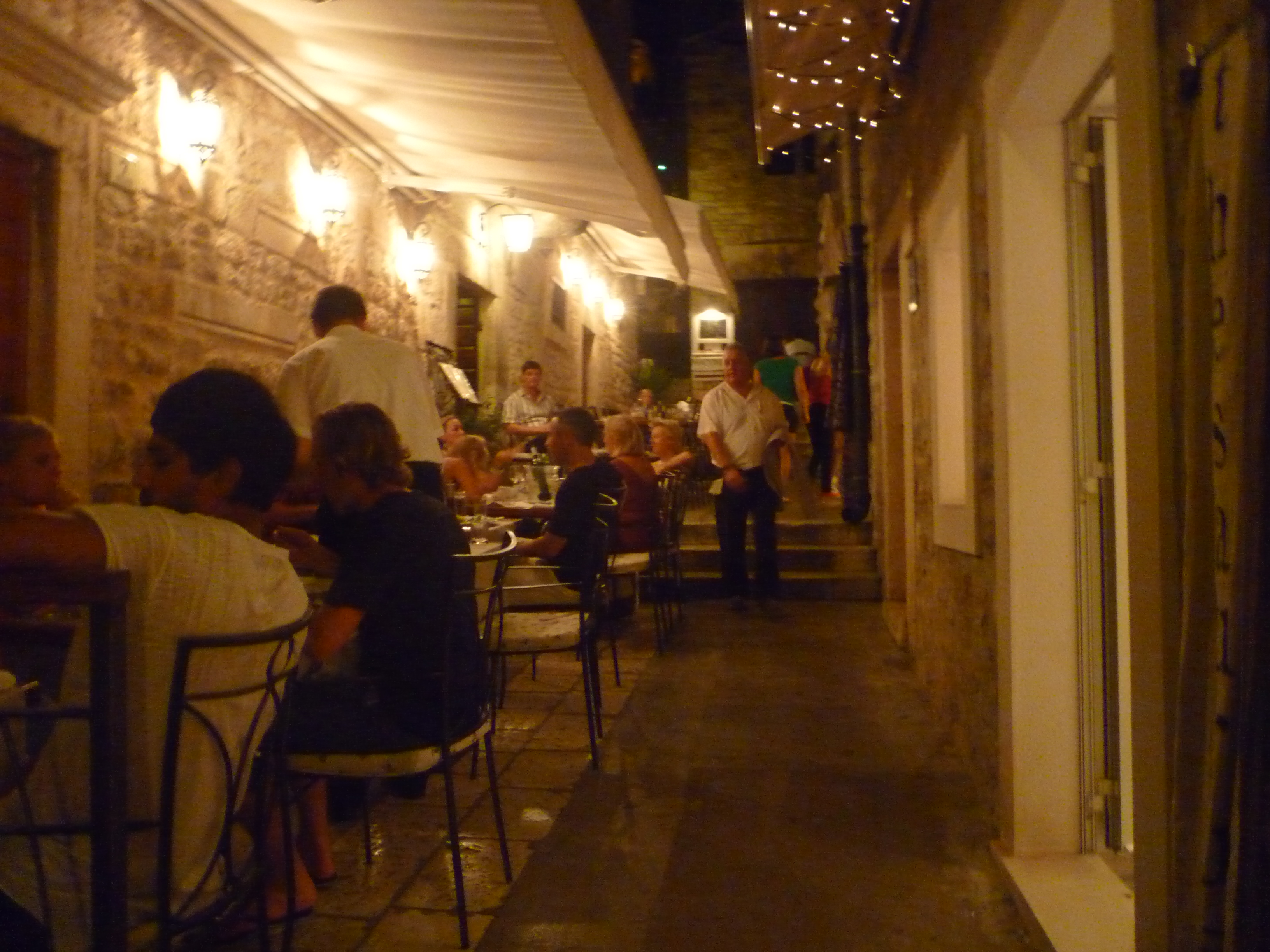 In the evening, we headed into Hvar town, which is quite a funky place to be at night. A group of dancing people spilled out into the street to the time of their music, while rich-looking cruiseship customers milled around and drank from streetside tables, watching the sunset. A number of bars seat their customers on cute tables on narrow staircases, so that you have to walk past them, and a lot of the town is hidden down narrow, stone streets. We ended up at a restaurant recommended to us by the hostel, the Marinara, which was nice but clearly touristy and overrated. I had tuna steak with olive sauce, which was delicious, while Jeff tried black risotto – coloured by cuttlefish ink – which was surprisingly good, too. Hermione opted for shark meat, which filled me with distaste (after watching Sharkwater I am quite keen on protecting sharks and the sea in general) but I had to try a bite, and yes, it was good. Not saying I’d order it myself, but when the opportunity presents to try something unusual I like to take it.