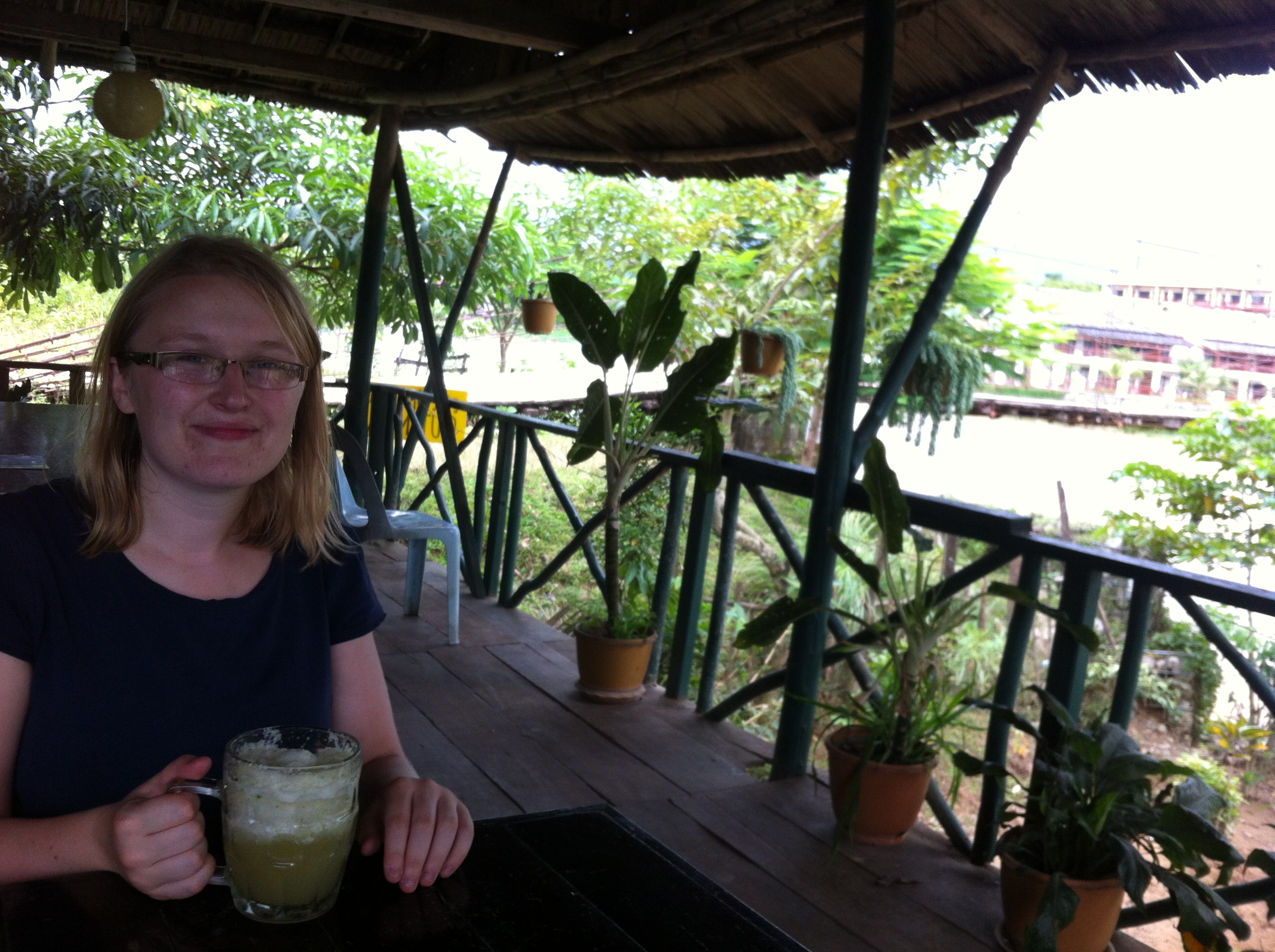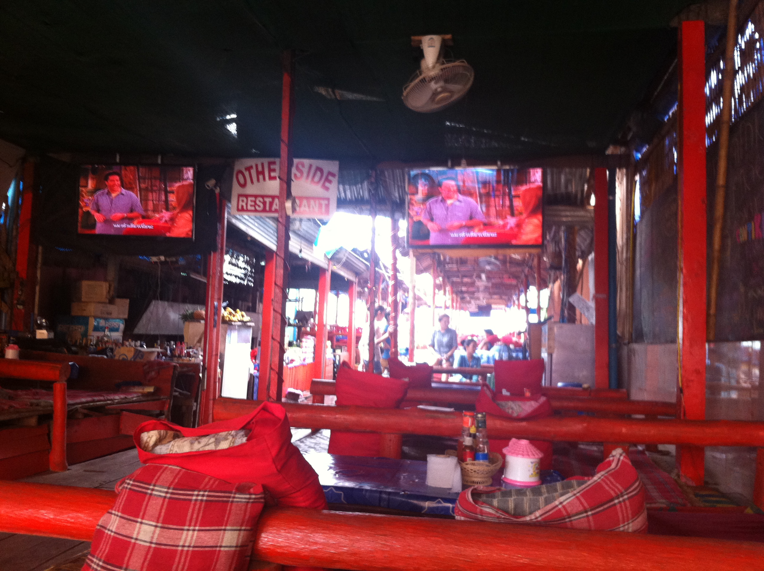 The second day presented nothing but torrential rain, so we decided to be lazy and do what the other tourists do… set up home in one of the cushion places! By this I mean bars that stretch out across the river on piers, covered with bamboo roofs and full of high-rise seats where you can sit all day and watch Friends or South Park while eating stir fry and sipping coconut shakes.