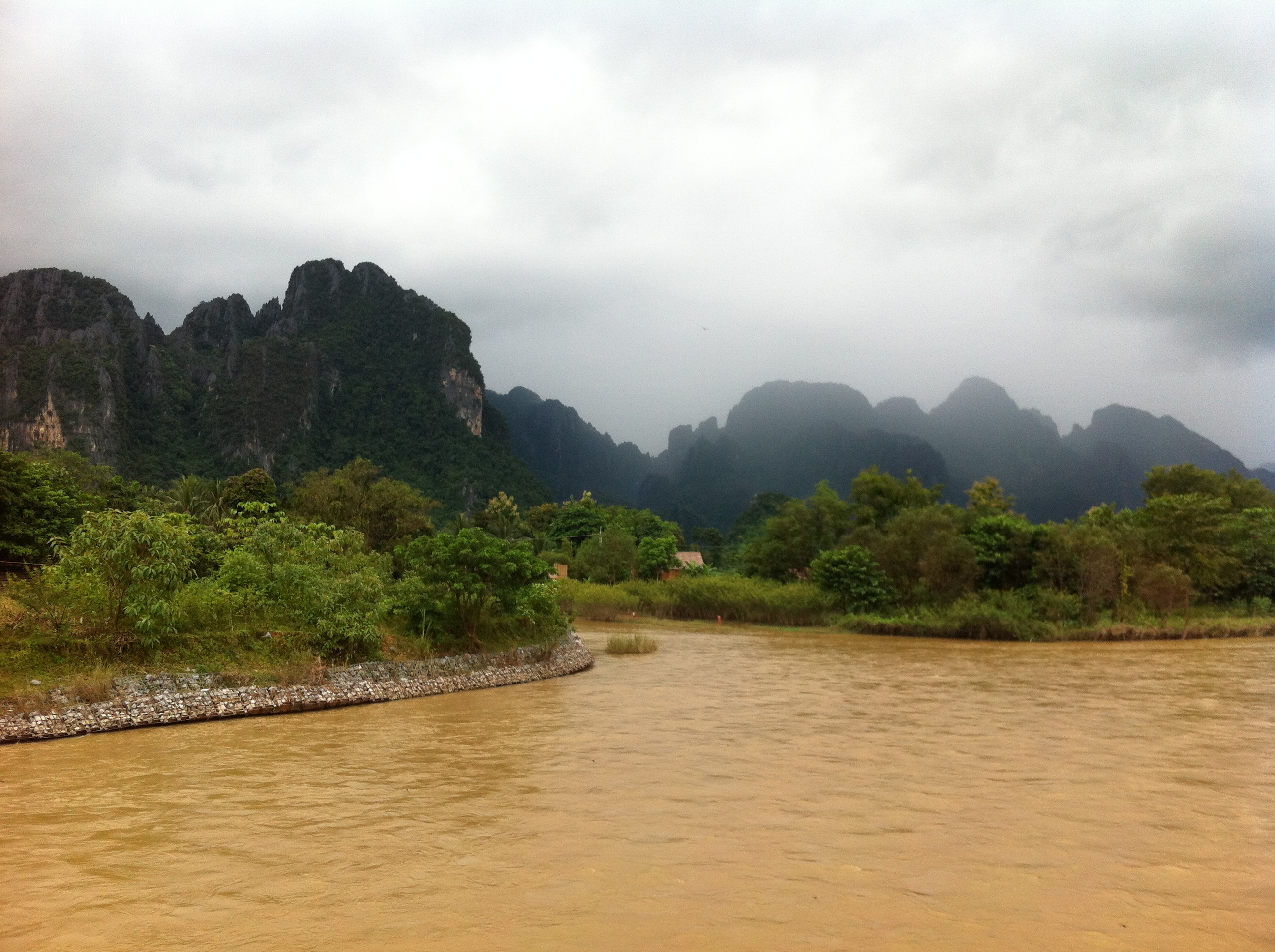 Vang Vieng was once just a stop on the way to Luang Prabang, but has more recently become a tourist hot-spot in its own right. The main reason for this was the attraction of getting blindingly drunk while riding massive inflatable tubes along the dirty river. As one tourist per month died while tubing or jumping in the river, and several more were injured, the government has cracked down on this. At the moment, according to Wikitravel, only four bars are open for tubing now, the swings and slides are gone, and there are restrictions on music volume. Shucks.