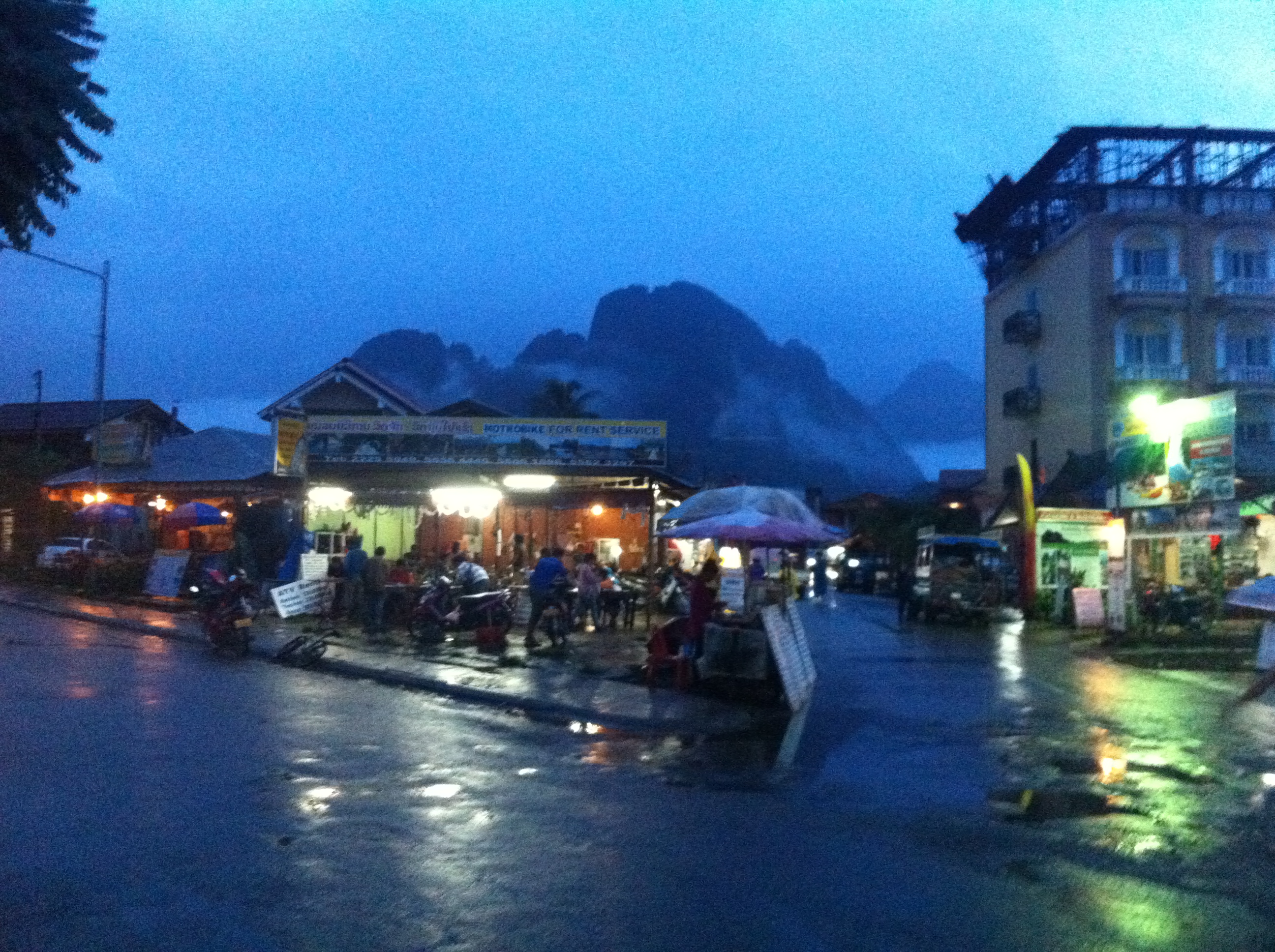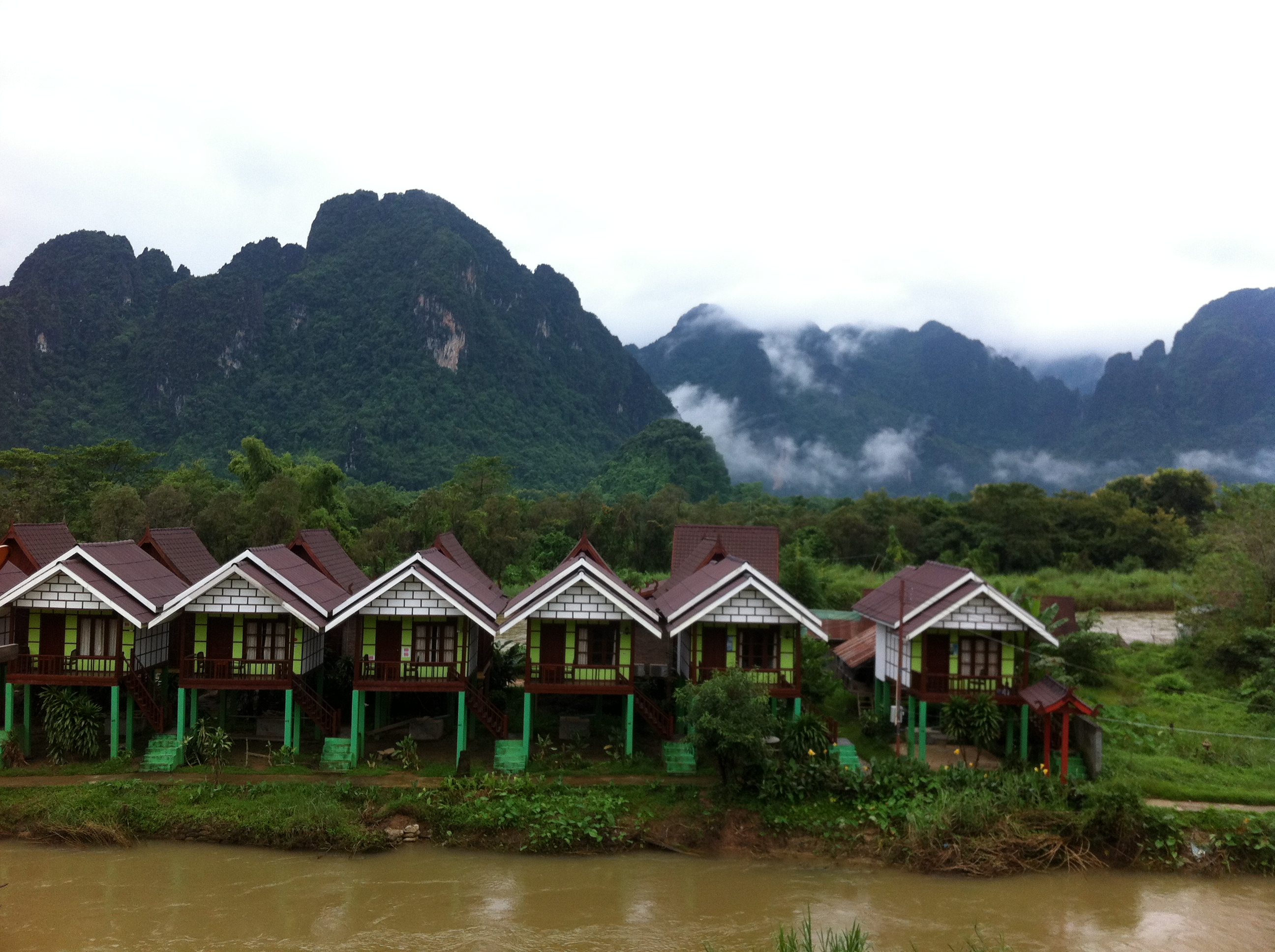 The bus stops in a pretty central spot – Vang Vieng is mostly one long street and a river, so it’s hard to get too lost. There are plenty of hostels along the main street. We opted for Sengkeo (Bob)’s guest house, at the southern end of the road, as we’d been considering helping out with their eco-project and had not been able to, so instead thought we’d support the project with a bit of money. You can view the website for the guest house and the project at saelaoproject.com/guesthouse/ .